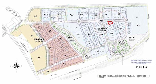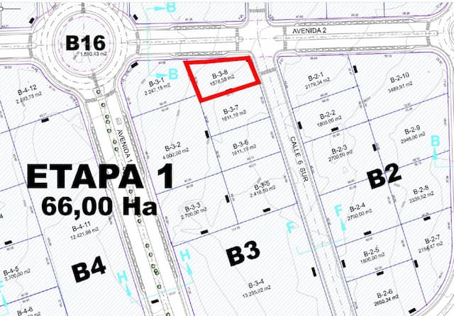 Uno de los terrenos destacados corresponde al lote B-3-8, emplazado en esquina con calle de servicio, con una superficie de 1.578 m² y valor de venta UF 5.834.